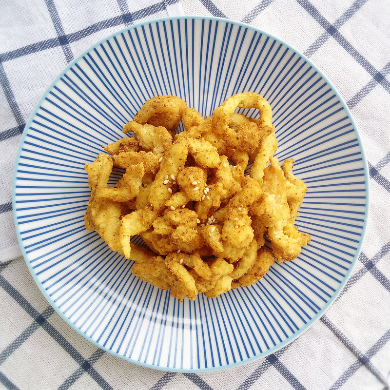 10:用漏勺将鸡柳打散,中到大火炸至3-5分钟。看个人口味