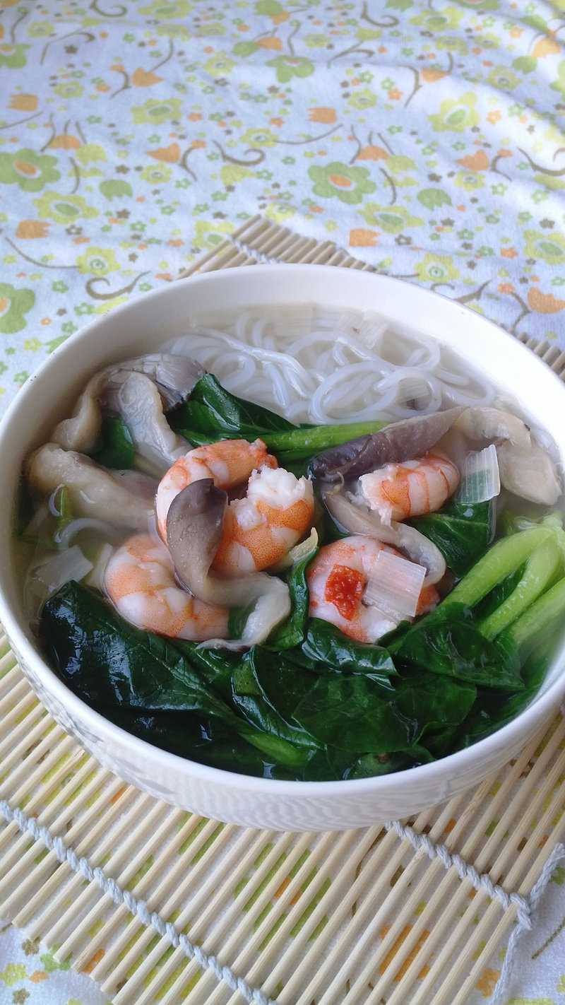 干米线适量;平菇少许;虾少许;小油菜少许;大骨汤适量;