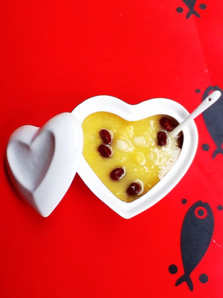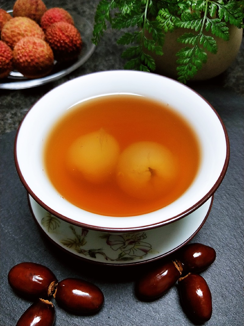 3:将红枣洗净和荔枝肉一起加入绿豆锅里,盖紧煮开后,转成小火再煮一小会离火。(如果想吃软点的红枣,可以同绿豆一起先煮)