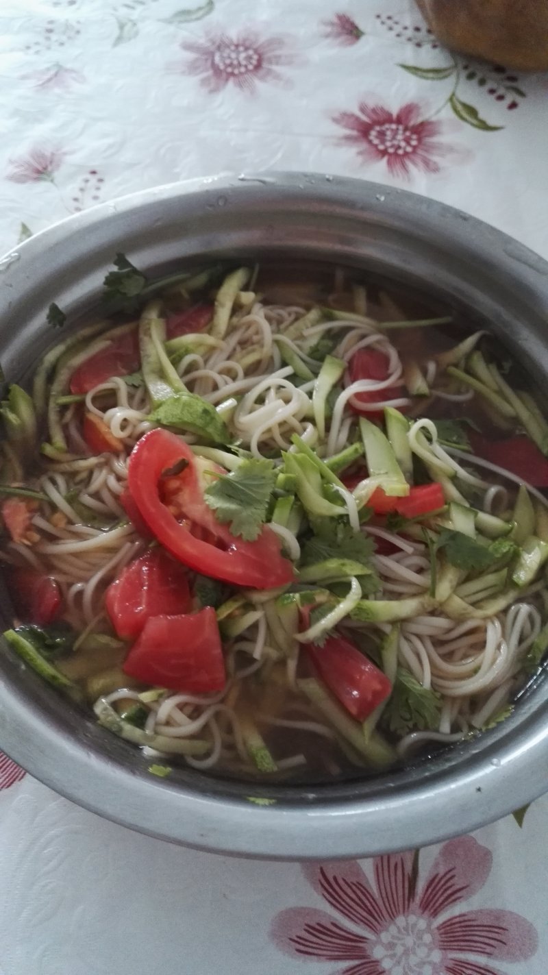 挂面适量;黄瓜一个;西红柿一个;香菜一颗;