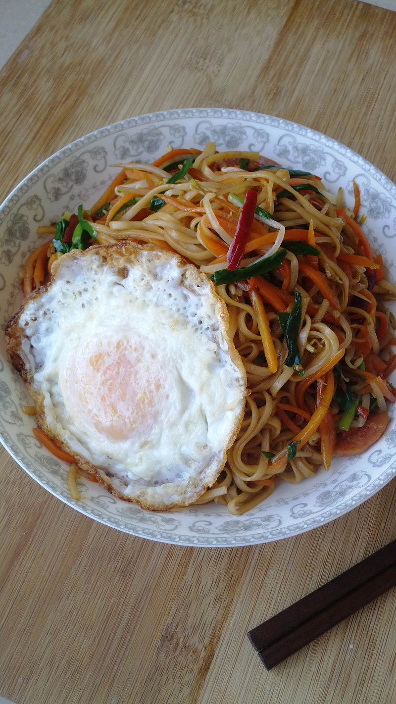 挂面一小把;鸡蛋一个;胡萝卜少许;豆芽少许;韭菜少许;香肠少许;