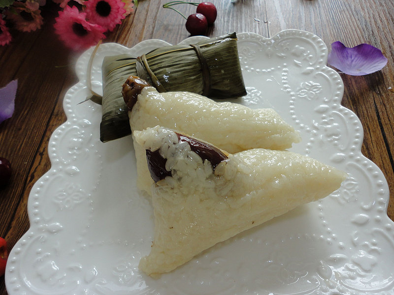 5:取两——三张粽叶重叠,卷成漏斗状,放入一下和好的红豆糯米。