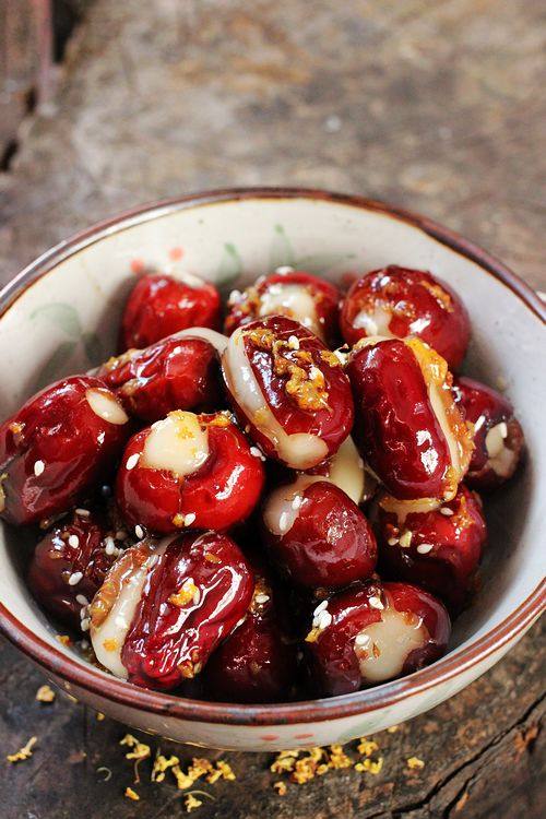 蜜汁糯米枣是一道经典的中式甜点,以红枣和糯米为主要食材,口感香甜软糯,制作方法多样。常见的家常做法包括:将红枣去核后填入糯米团,蒸熟后淋上蜂蜜或糖浆;或搭配桂花、枸杞等增添风味;也可用油炸至外皮酥脆,再裹上蜜汁。有的做法会加入豆沙、坚果等馅料,丰富口感。步骤简单,成品色泽红亮,软糯不腻,适合作为家常甜品或宴客小点。