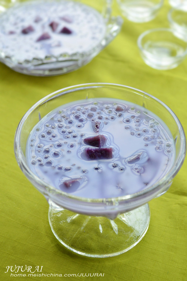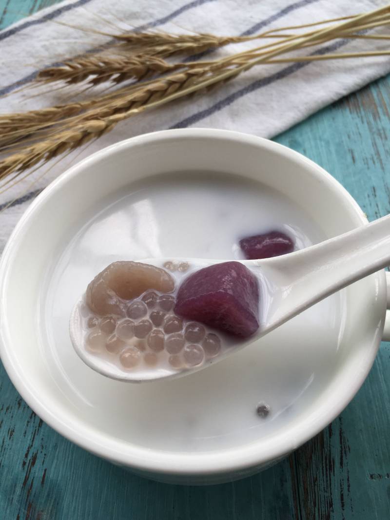 1、紫薯家里有蒸锅的,切丁蒸熟也可以的。2、这道甜品主要西米比较花时间,大家不急,一定让他煮久一会,到中间剩下小白点再焖。用凉水冲一下吃起来口感比较好。