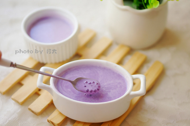 2:把紫薯削皮,切片,蒸熟,然后加牛奶(牛奶的量自己可以看着倒哦!)