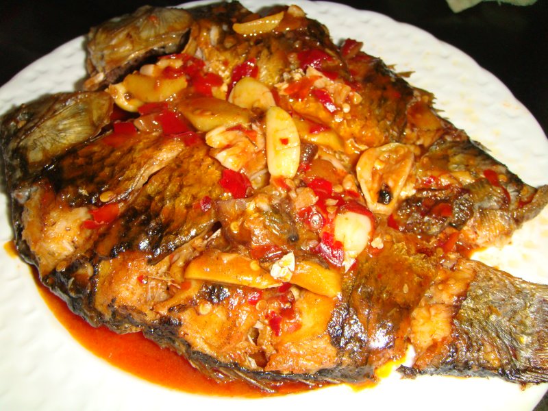 4:锅里油烧热(可以撒少许的盐)把鲫鱼煎炸至两面焦黄。