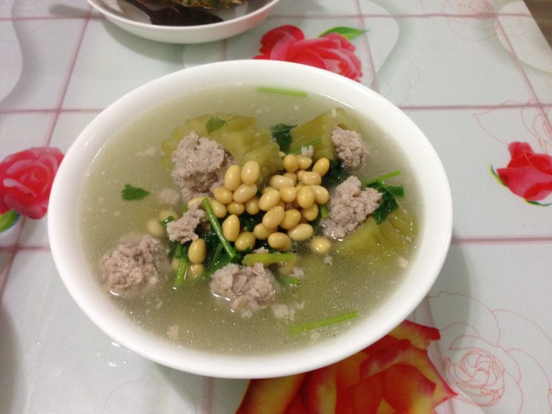 7:把塞好肉碎的苦瓜放入煮了半小时多的黄豆汤中大火烧开转慢火继续煲。