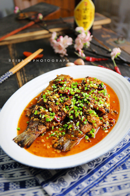 8:最后将汤汁浇在鲫鱼身上,撒满葱花就完成了。