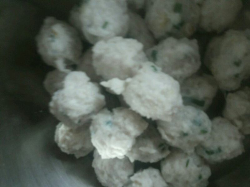 12:舀入的量以锅的容量为尺度,然后开小火,让水温慢慢上升,但千万不要让水煮沸,最高达到90度即可,小火慢慢把丸子浸熟,待丸子都飘起来,稍微等上半分钟,就可以把丸子捞出了