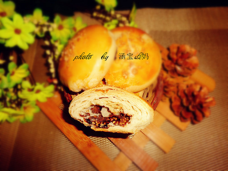 3:取其中一份擀开,放入一勺红糖,适量芝麻