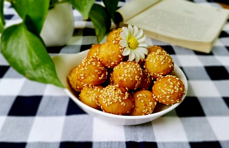 6:锅里加适量油烧至六成热下入芝麻球炸至表面金黄捞出,再复炸一次即可