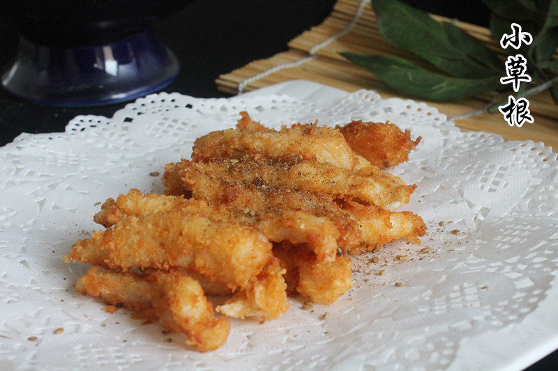 8:炸至鸡柳熟透,酥脆、颜色金黄,控油捞出。