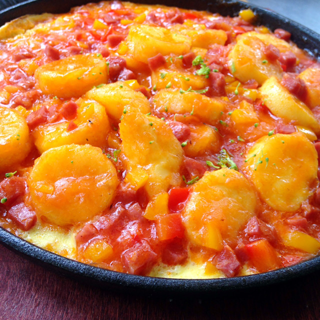 日本豆腐2个;鸡蛋2个;淀粉1汤匙;台式腊肠2支;红彩椒1块;黄彩椒1块;
