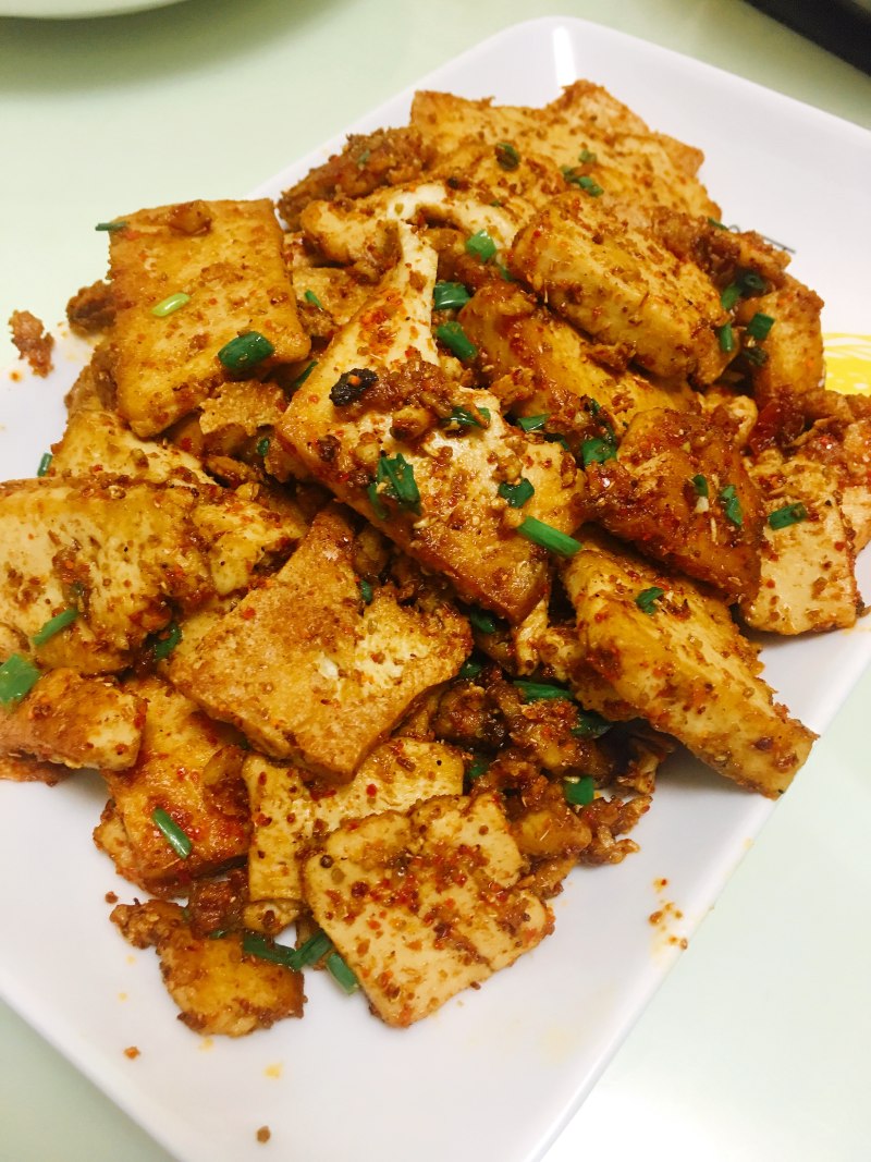 6:此时豆腐底面已煎黄,先把大蒜碎和葱碎下锅,稍等一会儿之后把咱们之前准备好的酱料均匀刷在豆腐上面。可以往锅里再补一些油,最后撒上备好的干料,再煎一会儿就可以开吃了。