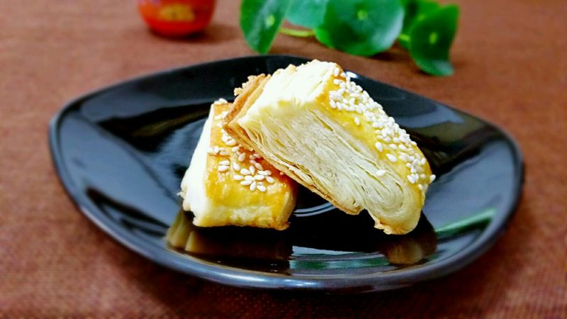 6:表面刷一层全蛋液,洒适量芝麻,放入预热好的烤箱中层;建议温度及时间:上下管均为200℃,加热15分钟至酥皮膨起,表面呈金黄色即可(此温度时间为参考值,请根据自家烤箱性能调整适合的温度及时间