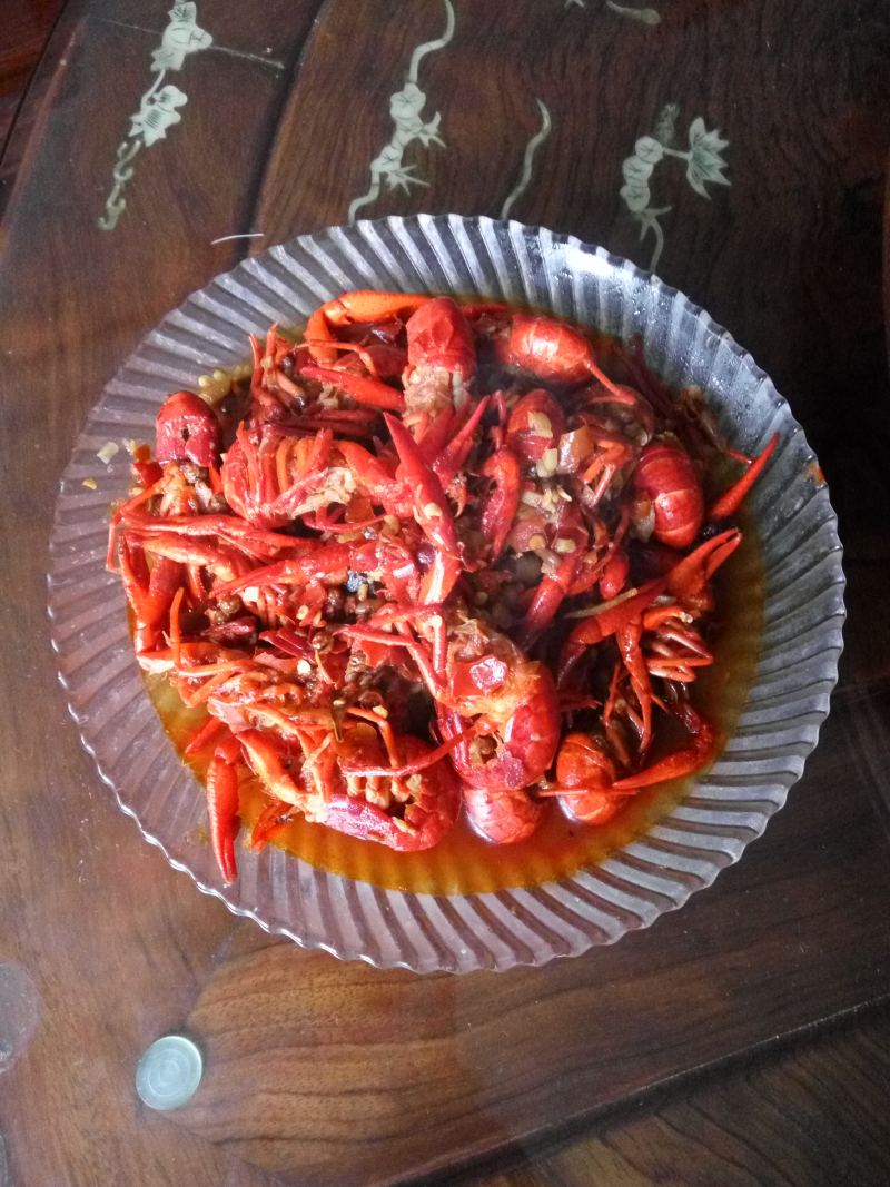 2:由于卖龙虾的说是沅江里的龙虾,也确实很干净,所以买回后只洗了三次。将洗干净的龙虾放入开水里,煮成红色,捞起备用。大火将锅烧热,放油。将腌辣椒,豆瓣酱以及生姜,壳蒜放锅里爆炒出香味,将捞起备用的龙虾倒入锅内翻炒。