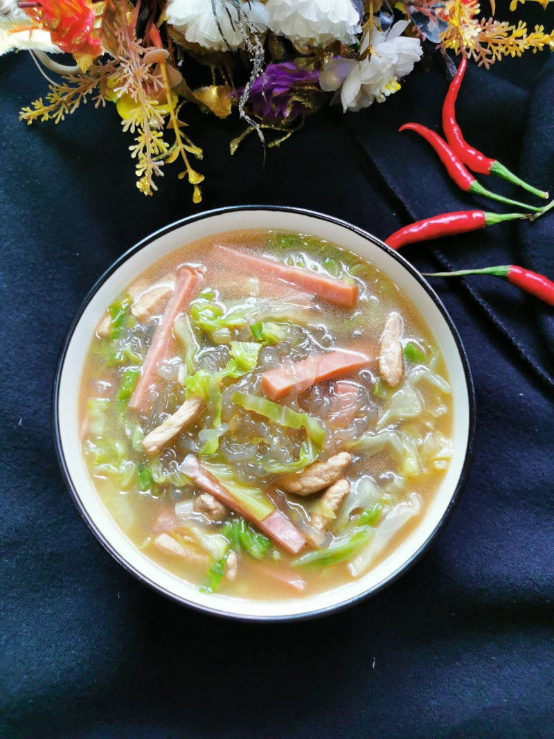 4:然后放入火腿,再打一个蛋进去,继续小火煮5分钟。