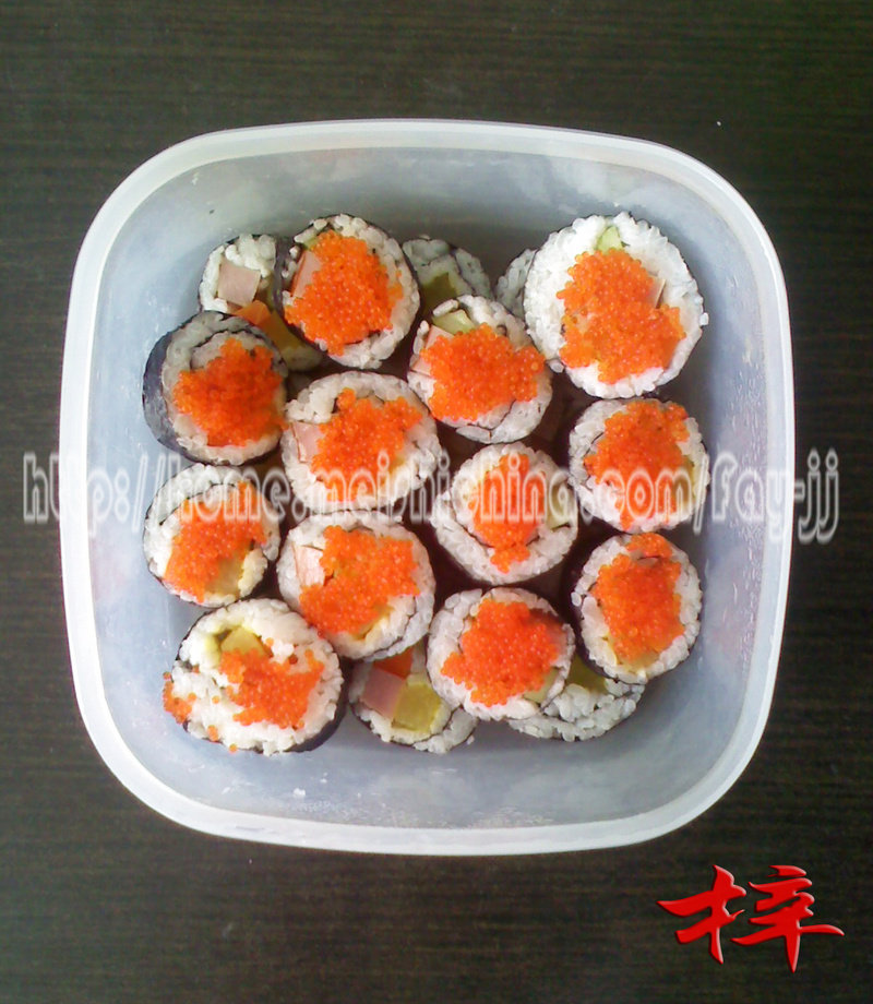 1、寿司醋不要太甜,口味微酸比较好。2、烟熏火腿可以用其他食材代替,比如金枪鱼罐头、干酪片、鱿鱼丝等等。3、米饭不要铺得太厚,否则既不容易卷起来,而且成品太粗也不方便入口。4、切寿司时刀上微微蘸水或者抹一层橄榄油,这样切起来不容易黏刀。5、蟹仔依个人口味,可加可不加,现在流行挤上芥末沙拉酱,口味也是极好的。