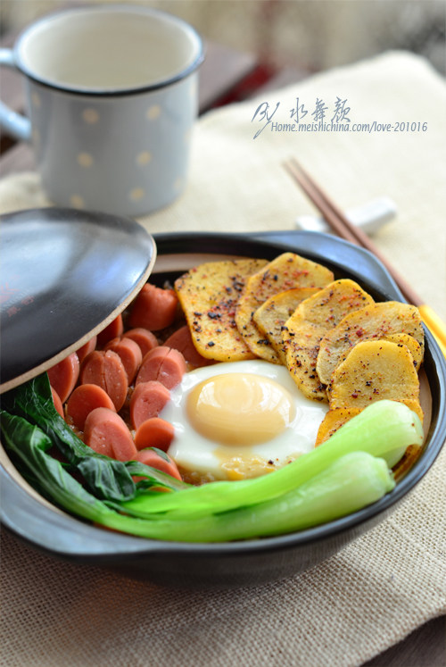2:把土豆火腿大米适量盐放入锅中煮饭档。