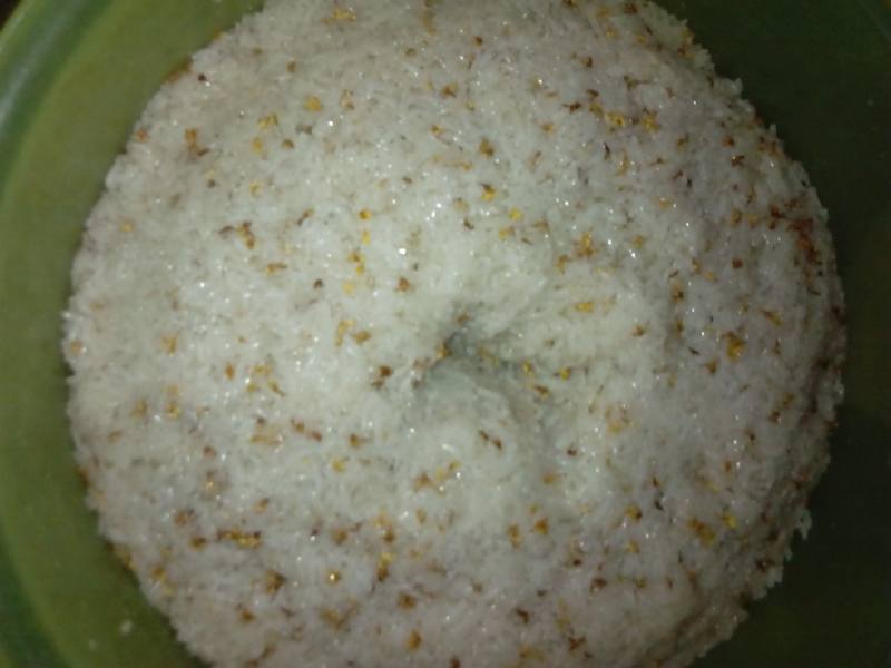 3:将甜酒曲和桂花倒入微热的糯米饭中拌匀