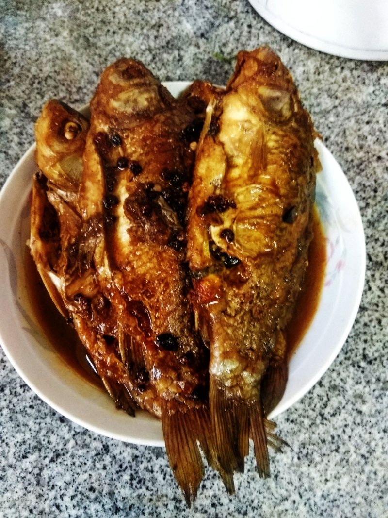5:放盐、老抽、陈醋加适量清水。盖上锅盖煮呗,水差不多去了2/3时候,鱼完全入味,先用大火烧开后中大火炖,等汤汁浓稠时便好了。