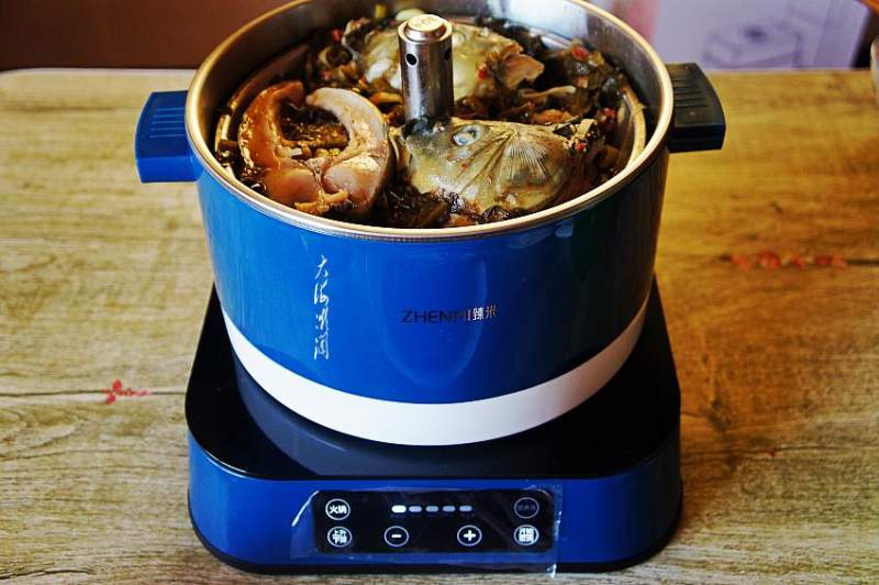 4:大火烧开2分钟后关火,这时锅底料就做好了,鱼头也煮得差不多了,其中一半倒入火锅中,另一半倒入盆中,随时添加,端上桌启动火锅开关就可以开涮了。
