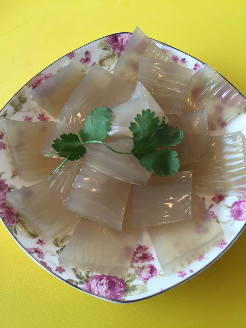 11:彻底冷却凝固后,将鱼鳞冻切片装盘,即可上桌食用!