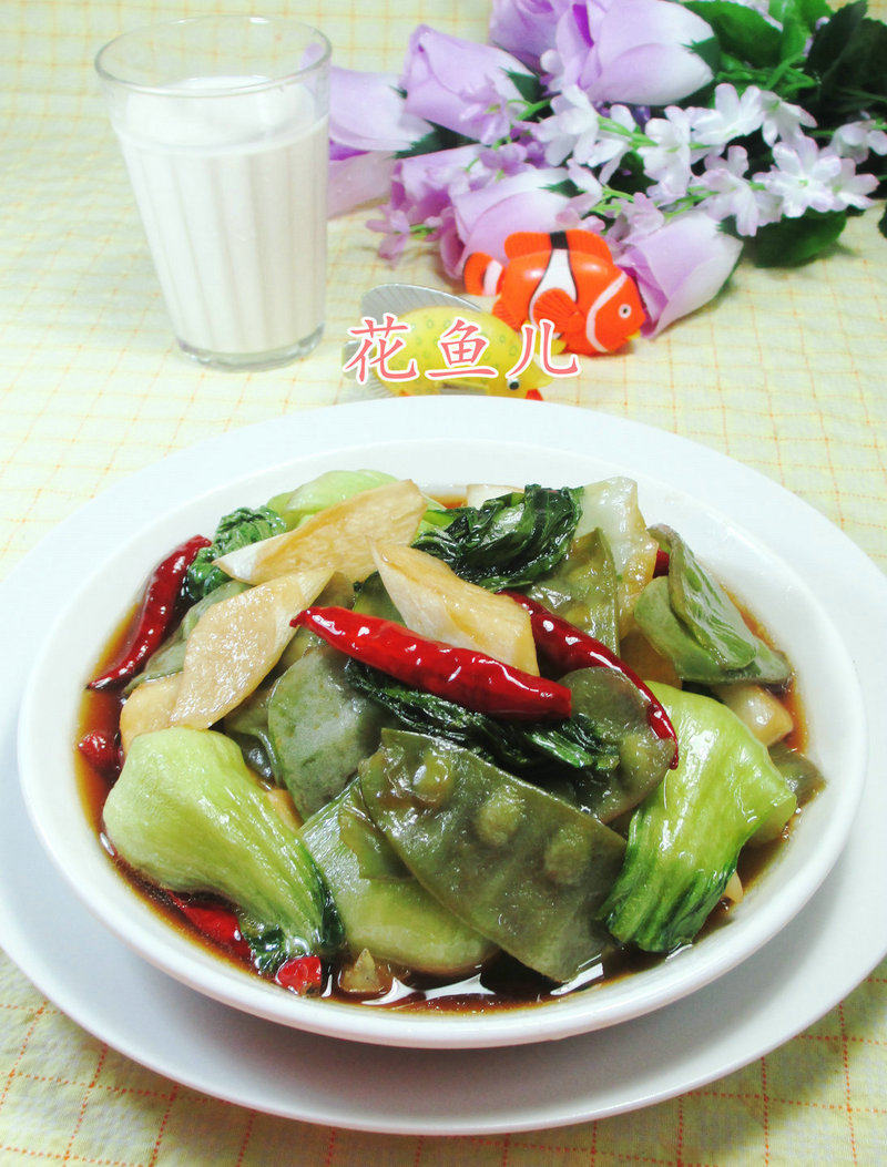 4:接着,合入切好的青菜,搁入干辣椒翻炒一下。