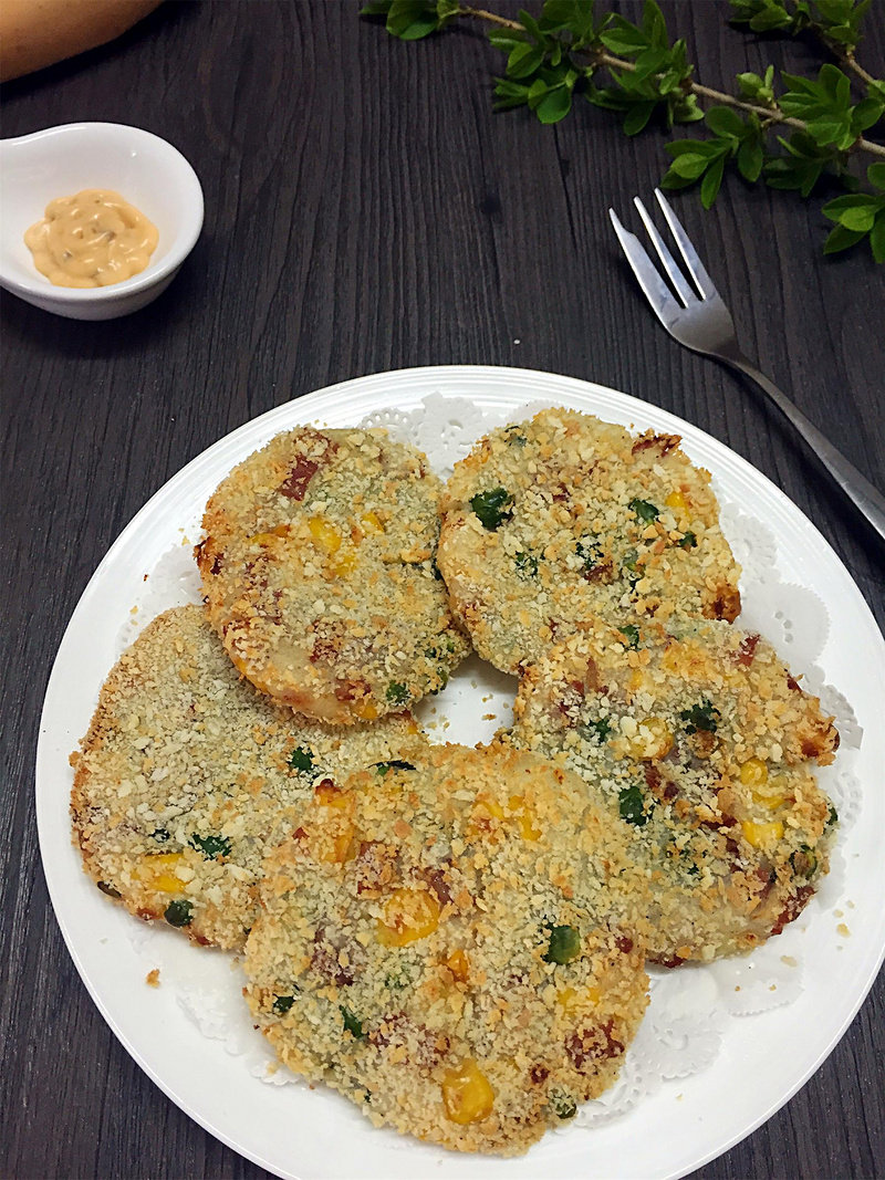 土豆泥130克;培根2片;熟豌豆60克;熟玉米粒60克;