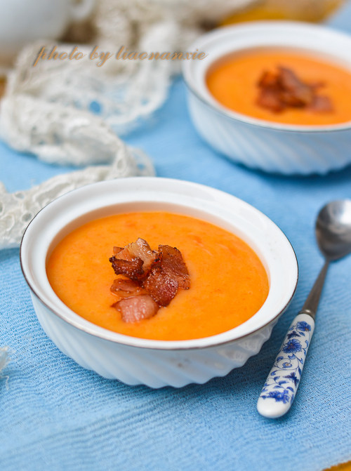 4:用手提式搅拌器将胡萝卜和土豆打成泥。