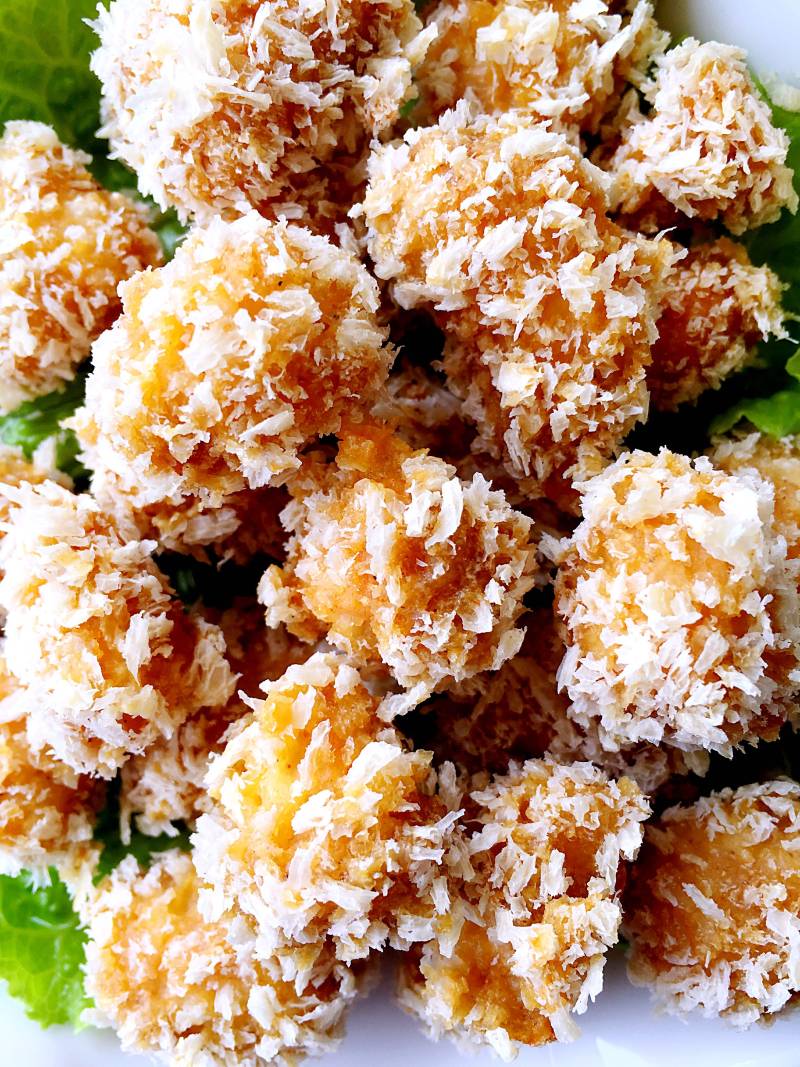 9:油锅烧6成热,放入鸡肉球炸至金黄色捞出