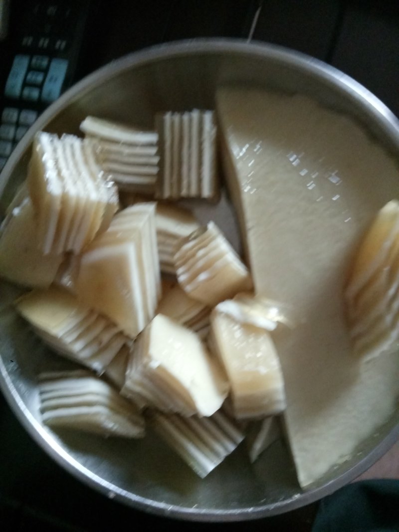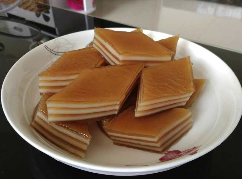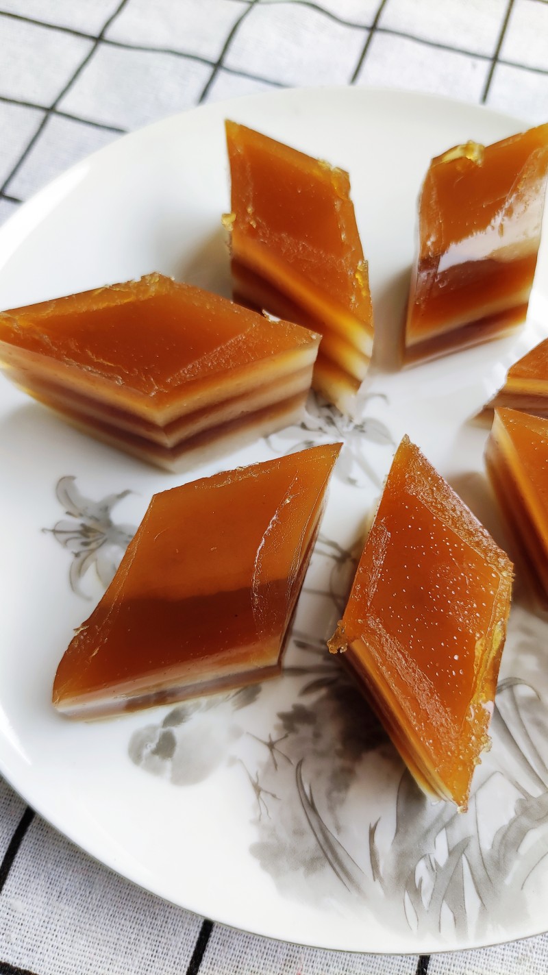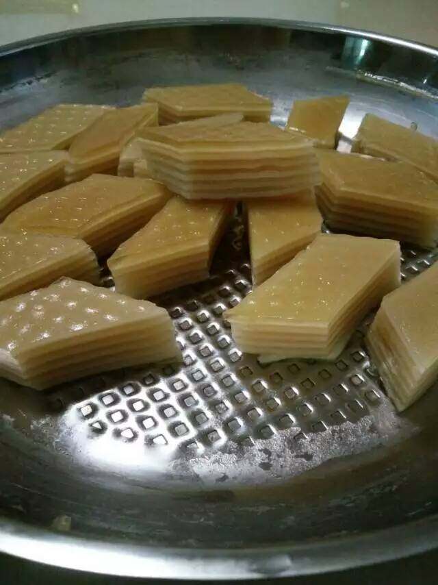 5:蒸熟拿出放凉后就可以切出菱形,本人觉得菱形比较美观本人觉得放入冰箱冻过后再吃,更有QQ的弹性,更好吃,更清甜。