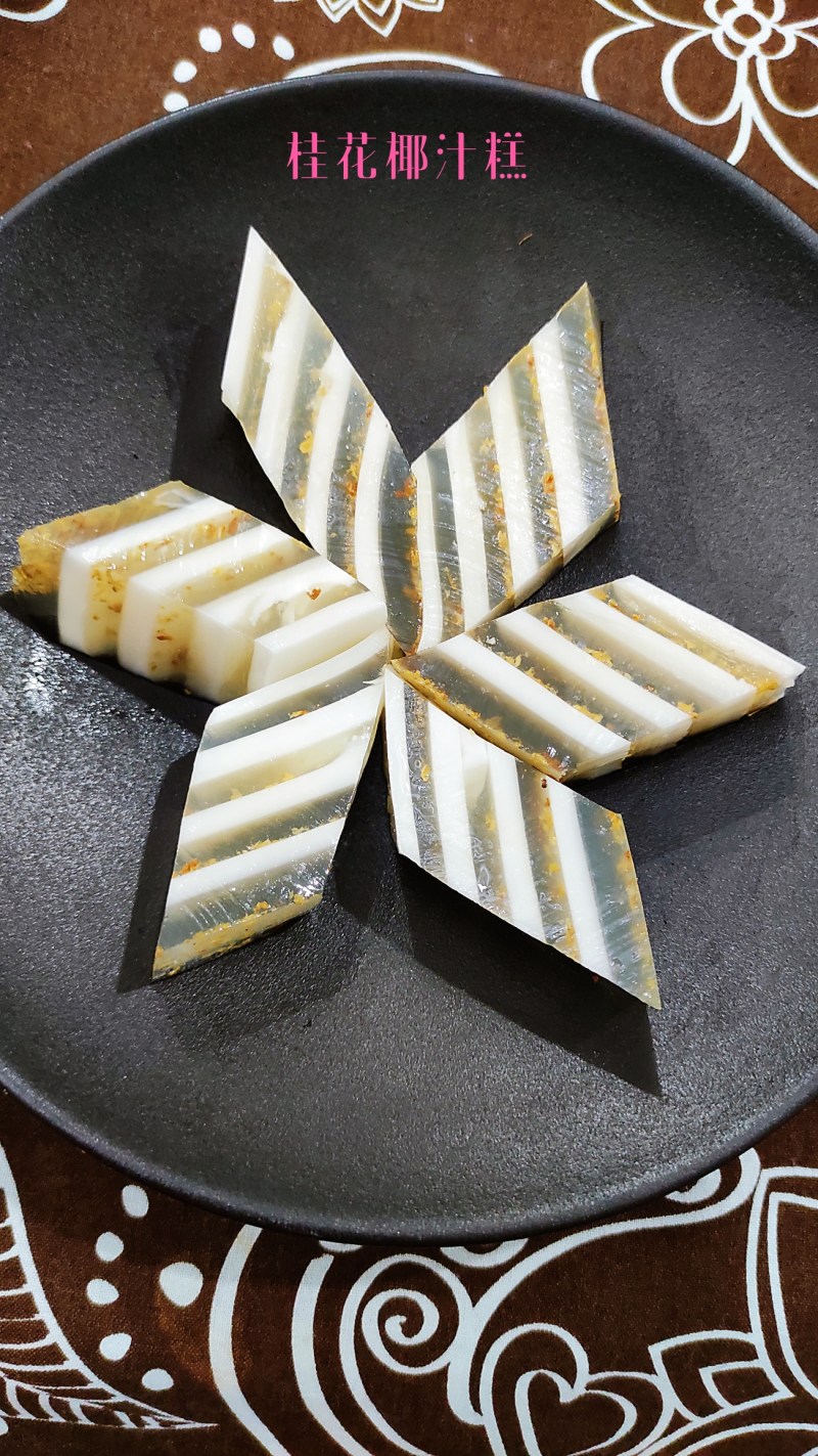 13:待桂花汁凝固之后再倒入一小碗的椰子汁,时候的椰子汁,我们一定要确保它是凉不然的话,容易把桂花汁烫化,就这样一层一层的让其凝固,就得到了美丽的桂花糕。全部冻结好之后,然后就脱模,脱模的时候,我们用一个牙签顺着一个塑料饭盒边缘深深划一圈就倒出来了。用刀切成你喜欢的形状就可以了。