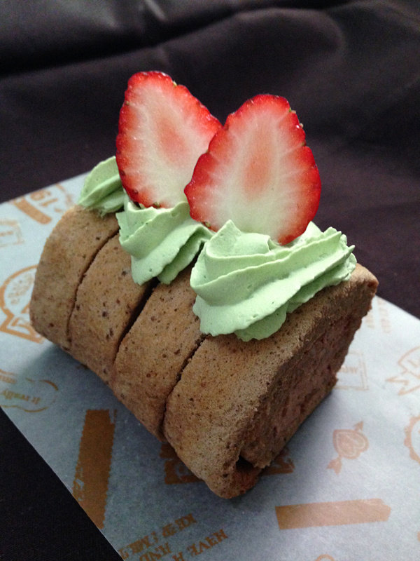 21:卷起后外面用油纸或锡纸包住,冷藏几小时定型即可。取出稍作装饰,我是挤了抹茶奶油,再加了草莓,红配绿很有圣诞的感觉呢。