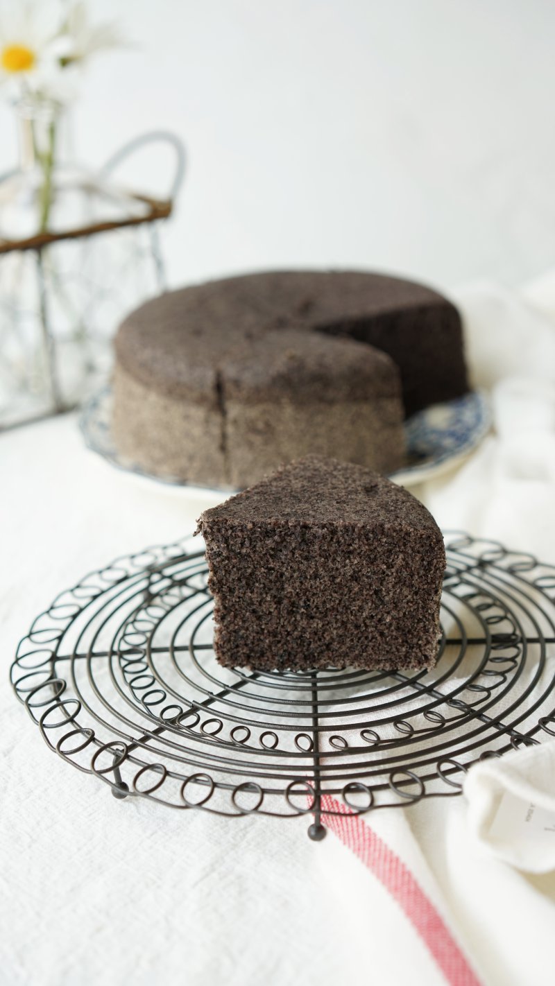 17:取出烤好的蛋糕,平摊到烤网上晾几分钟,面上虚掩一层油纸或锡纸晾至温。