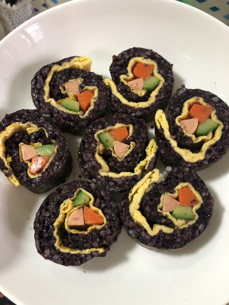 1.裹的时候一定要把竹帘卷紧。2.切的时候刀沾点儿水,能够防止粘粘。3.黑米和糯米的比例是2:1,也可以1:1。4.可以配上喜欢的酱料,比如蓝莓酱、蕃茄酱吃,味道更佳。