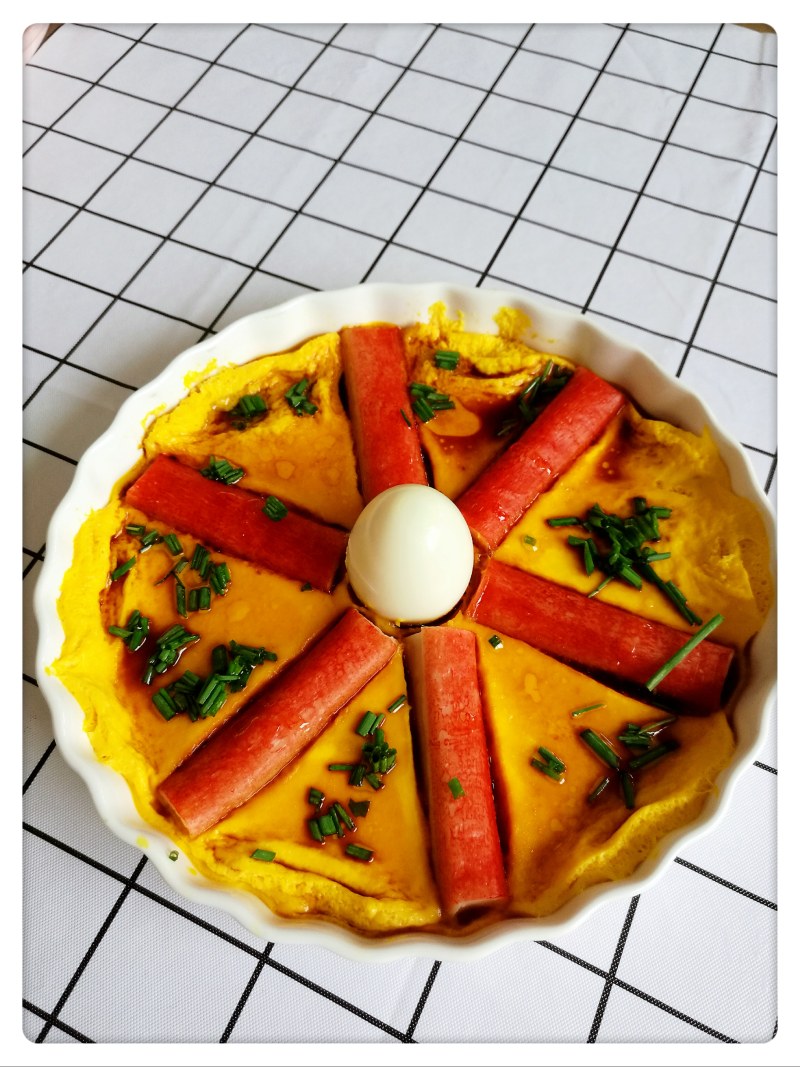 1:如图在盘中摆好蟹肉棒和水煮蛋。