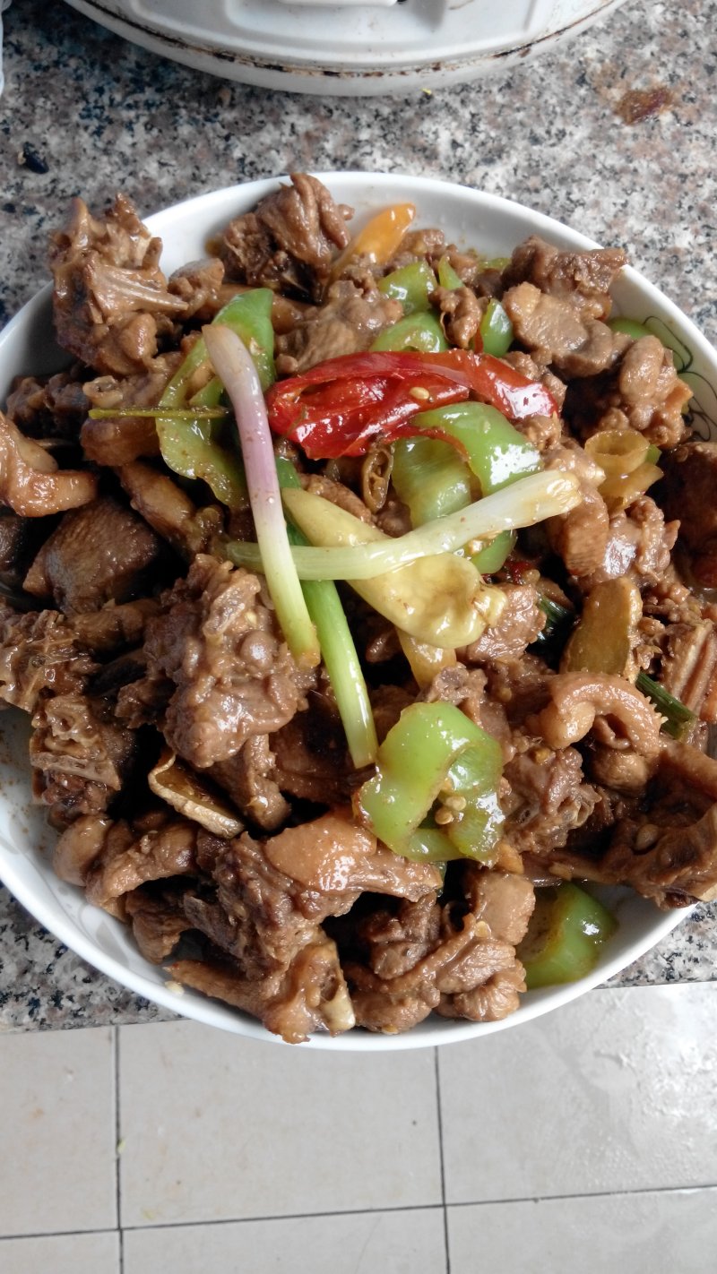 5:焖25分钟后,水干了,鸭子煸出油了,加入青椒葱段,翻炒至熟即可出锅