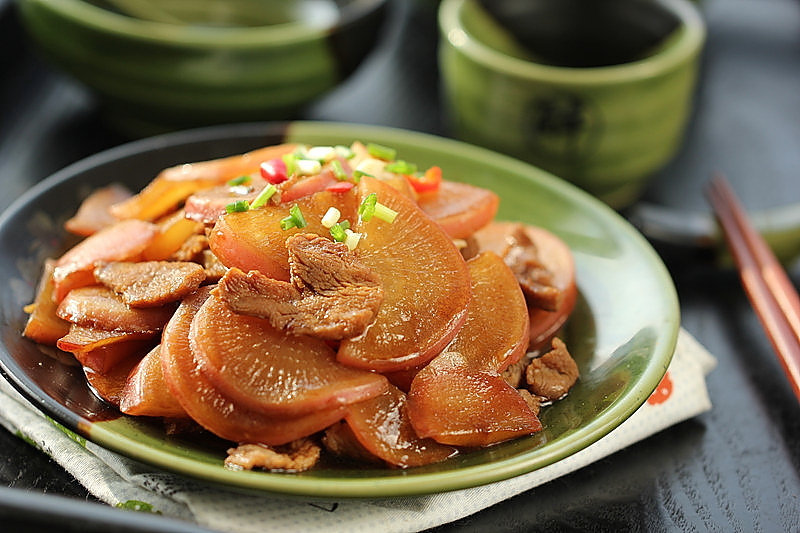 6:.鸭脯肉煸炒变色后下入焯过的萝卜片进去翻炒;