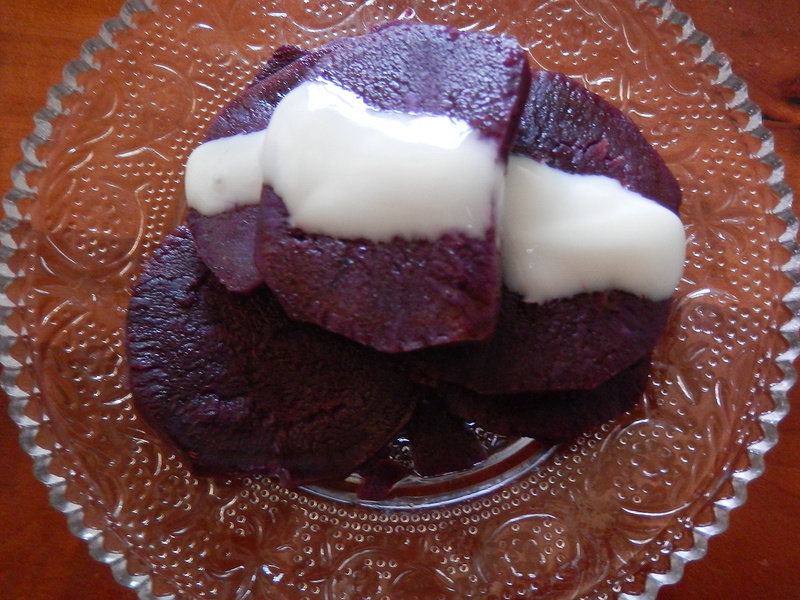 1:紫薯蒸熟后压成泥,用心形模具压实后倒出,再淋上酸奶