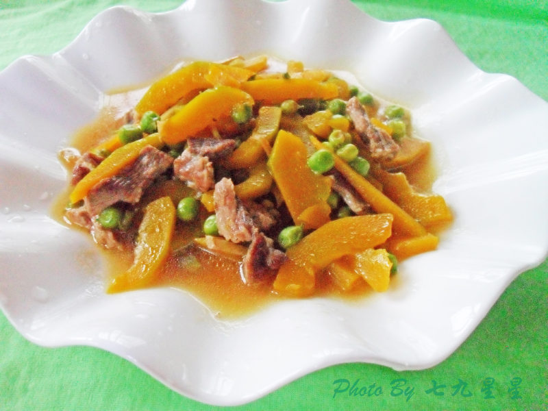 9:待南瓜和豌豆煮软,加入适量盐调味即可。(因为家里不吃味精鸡精等调料,所以没放)
