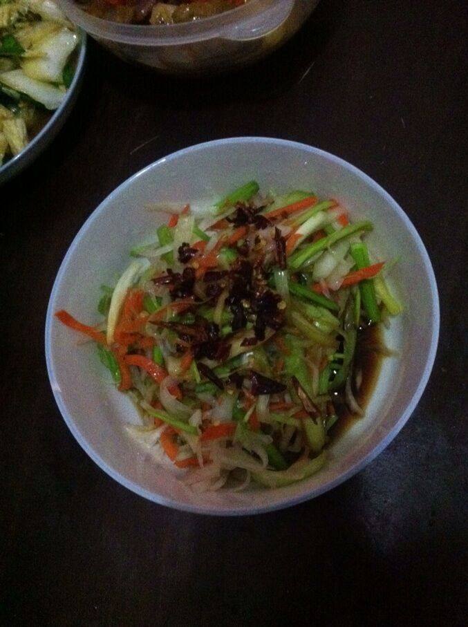 1:把购买回来的棒棒菜、青蒜、胡萝卜、小葱、干辣椒洗干净备用