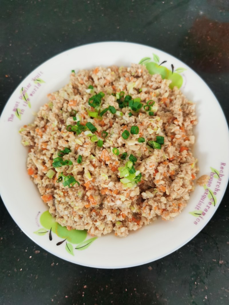 4:将各种蔬菜末倒入加少许蚝油,盐搅拌。