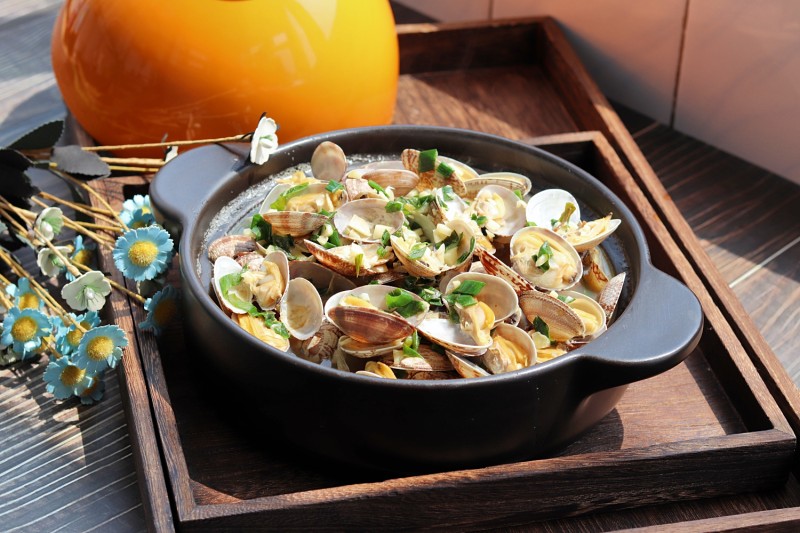 1:花蛤提前处理:放在清水盆里,滴几滴植物油,放2克盐,静置浸泡数小时,使花蛤张嘴吐沙,制作前将外壳轻轻搓洗干净。