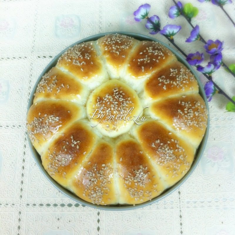 面团因为加入了马铃薯泥,所以会特别的粘手,整形时可以在手上抹少许食用油防粘;因为我是直接揉圆入模,所以省略了松弛的步骤;请根据自家烤箱的脾性调节温度;面粉的吸水性不同,可先预留10克水;清水可换成等量的牛奶;另外中间的面团比围边的面团稍微分量大点会比较美观。