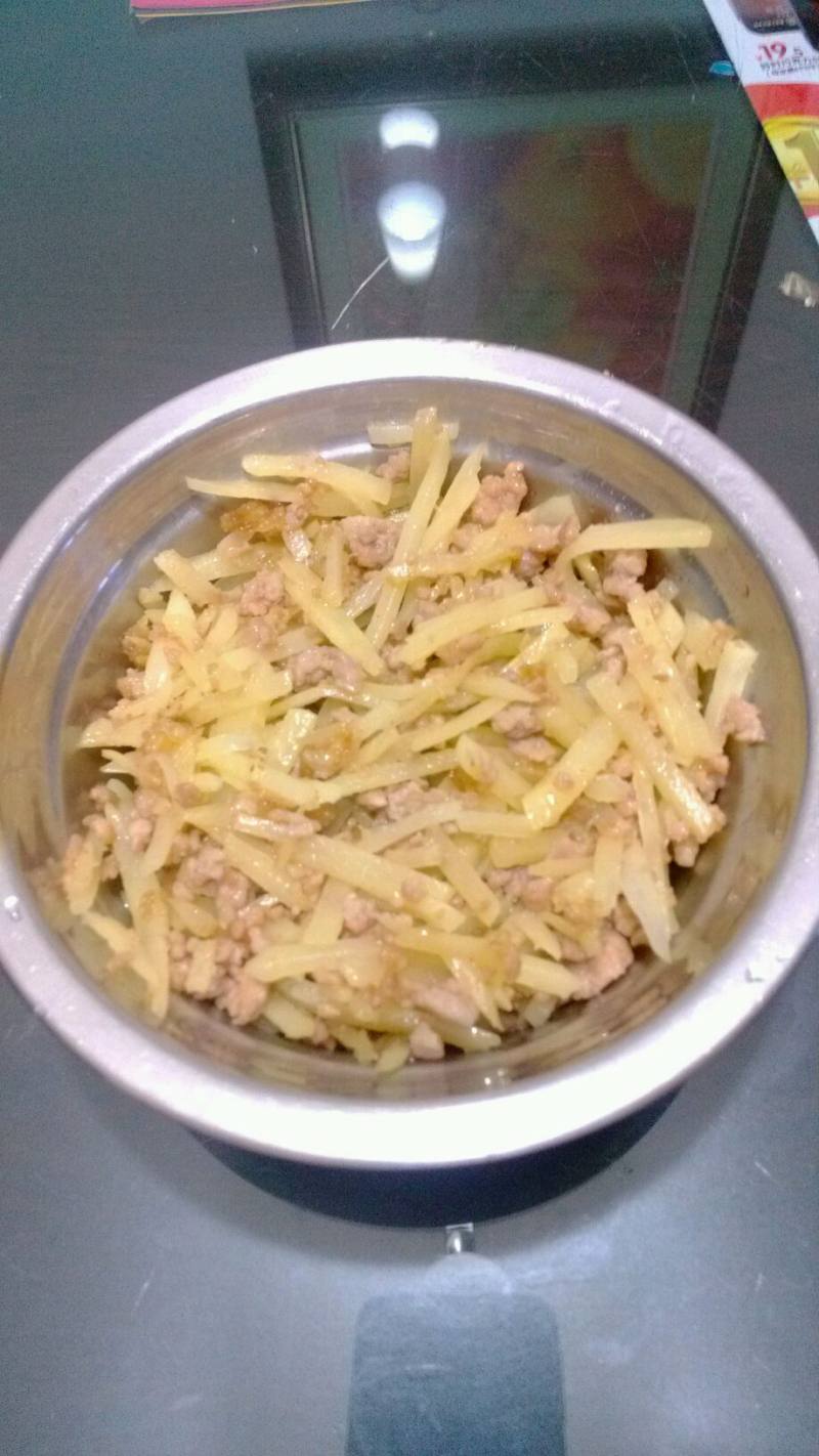 7:肉末炒了片刻后,把马铃薯和肉末一起炒。