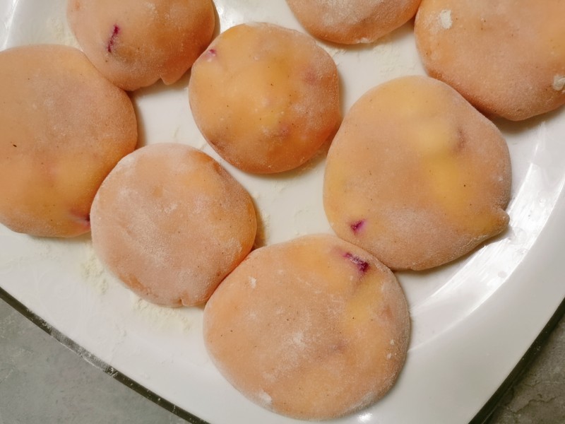 7:取出冷藏好的面团,将面团分成15克的小面团,粘上烤熟的手粉,把小面团压平,压成薄面皮,包入馅料即可