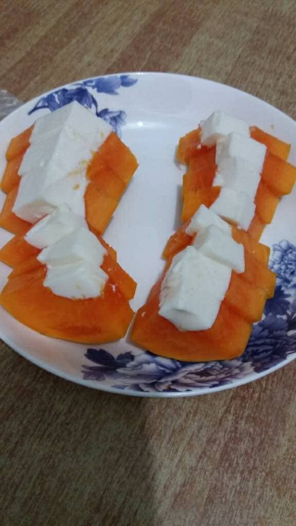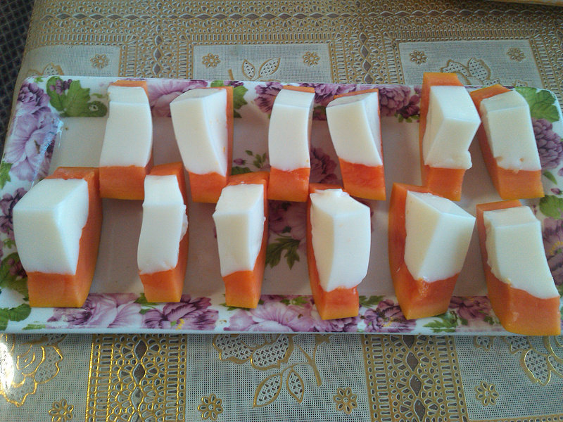 5:把木瓜放入冰箱冷藏2小时!切成小块,装盘即可!
