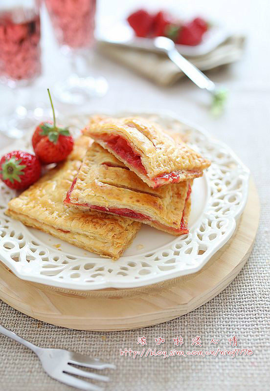派皮可以一次多做一些,然后切割成大小适中的尺寸,每张用烤纸隔开,装入保鲜袋,放冰箱冷冻,随用随取很方便。制作草莓馅时不要选择过度熟透的草莓,这种草莓汤汁比较多,不利于包馅,馅料也不宜放的太多,以免烤制过程中溢出来。可以根据个人口味喜好选择其他水果制作馅料。也可以买飞饼制作这个点心,会省事许多。