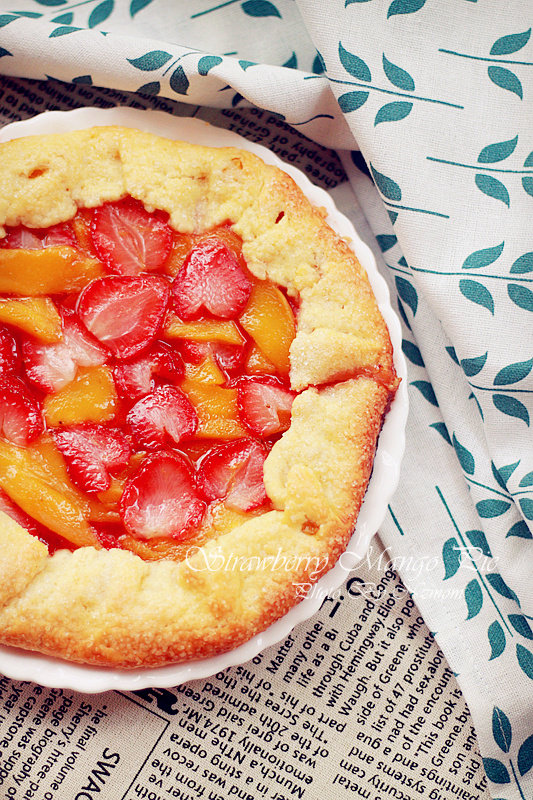 6:派皮周围刷上鸡蛋液,撒些粗糖,连同烘焙纸一起移到烤盘上;烤箱预热205度20分钟左右,中下层。取出烤好的派,把融化的果酱刷在水果表面即可。(此步骤我省略了,并不影响哈~)